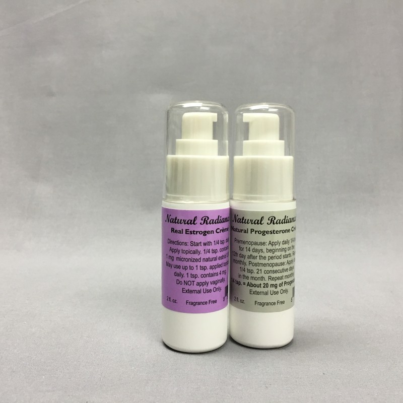 One 2oz bottle of Natural Radiance Natural Progesterone Crème and one 2oz bottle of Real Estrogen Crème packaged together.
