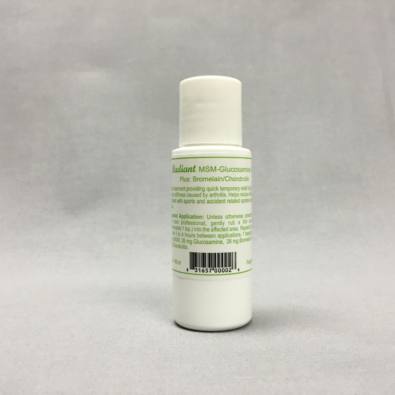 Radiant MSM • Glucosamine Gel is a topically applied gel used for joint maintenance. The gel is a combination of MSM, (Dimethyl Sulfone) Glucosamine, Bromelain and Chondroitin in a proprietary dermal delivery system. OurMSM/Glucosmine Gel is formulated for long term joint health. MSM (Dimethyl Sulfone) relieves inflammation in muscles and joints. MSM also provides sulfur to the connective tissue of the joint to promote joint health. MSM helps relieve pain and improve physical function in people with arthritis. Bromelain a natural anti-inflammatory derived from pineapple, is the number one herb used by herbalists for the treatment of inflammation. Glucosamine & Chondroitin are the popular duo that work together to alleviate joint pain and reduce inflammation. Glucosamine stimulates cells to repair damaged joints and form new connective tissue, while Chondroitin actually facilitates the entry of the Glucosamine into the joints.